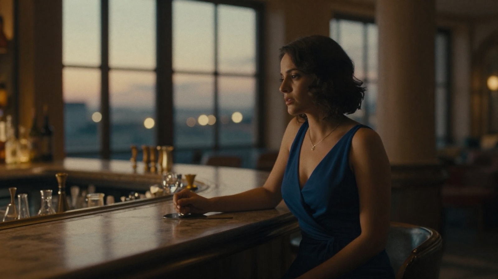 The night was filled with a mysterious glow when Elena entered the elegant bar. Her eyes were looking for the unknown that was in the air—a feeling she hadn't felt in a long time. She was wearing a deep blue dress that accentuated her figure, and the dim lighting made her look like an apparition.