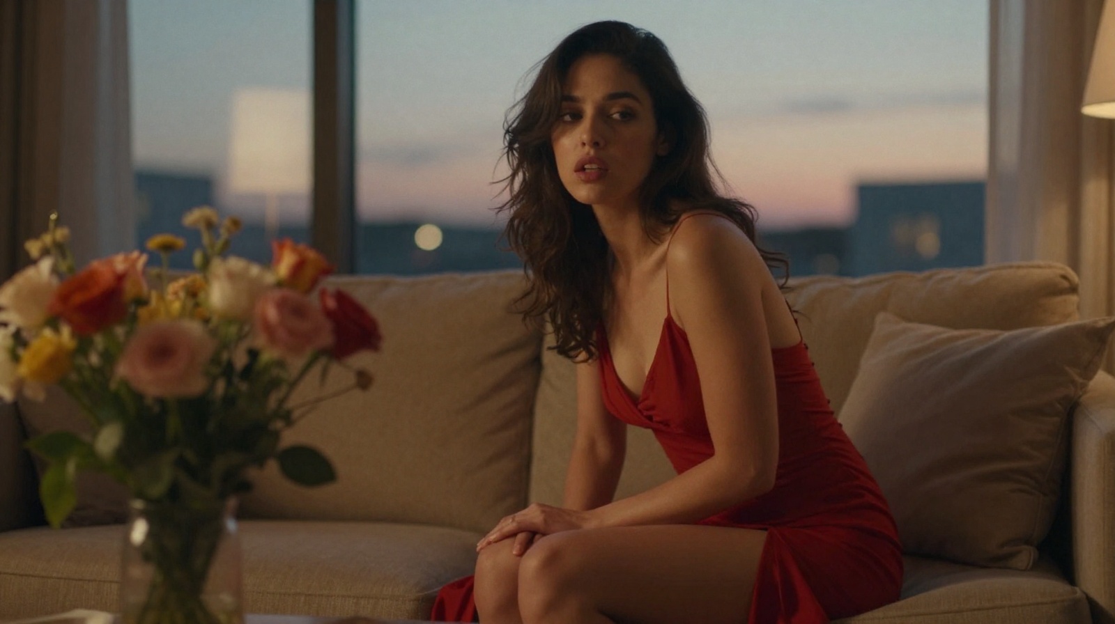 In the soft light of dusk, Anna sat in her cozy living room, which was filled with warm colors and the scent of fresh flowers. The day had been hot and the air was heavy with the expectation of a seductive evening. She had just gotten ready for him, wearing a soft red dress that played around her curves and made her skin glow.